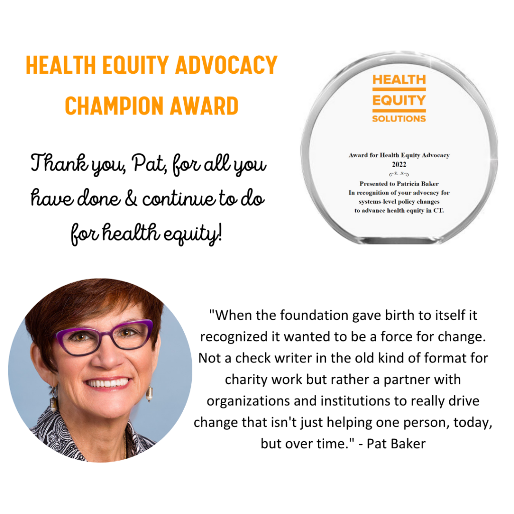 At this event, HES presented the first annual Health Equity Advocacy Champion Award to Patricia Baker, founding President & CEO of the Connecticut Health Foundation. In future years, the award will be given in honor of Patricia Baker to a Connecticut resident or organization that advocates for systems-level changes to promote health equity.